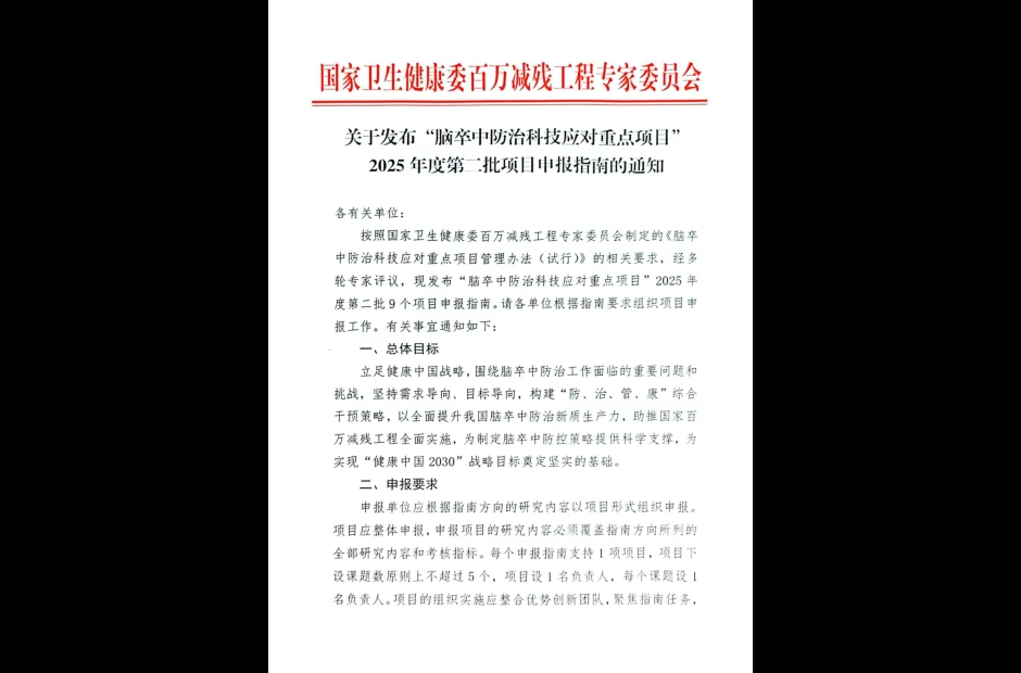 按照国家卫生健康委百万减残工程专家委员会制定的《脑卒中防治科技应对重点项目管理办法(试行)》的相关要求,现发布“脑卒中防治科技应对重点项目”2025年度第二批项目申报指南。请各单位根据指南要求组织项目申报工作。